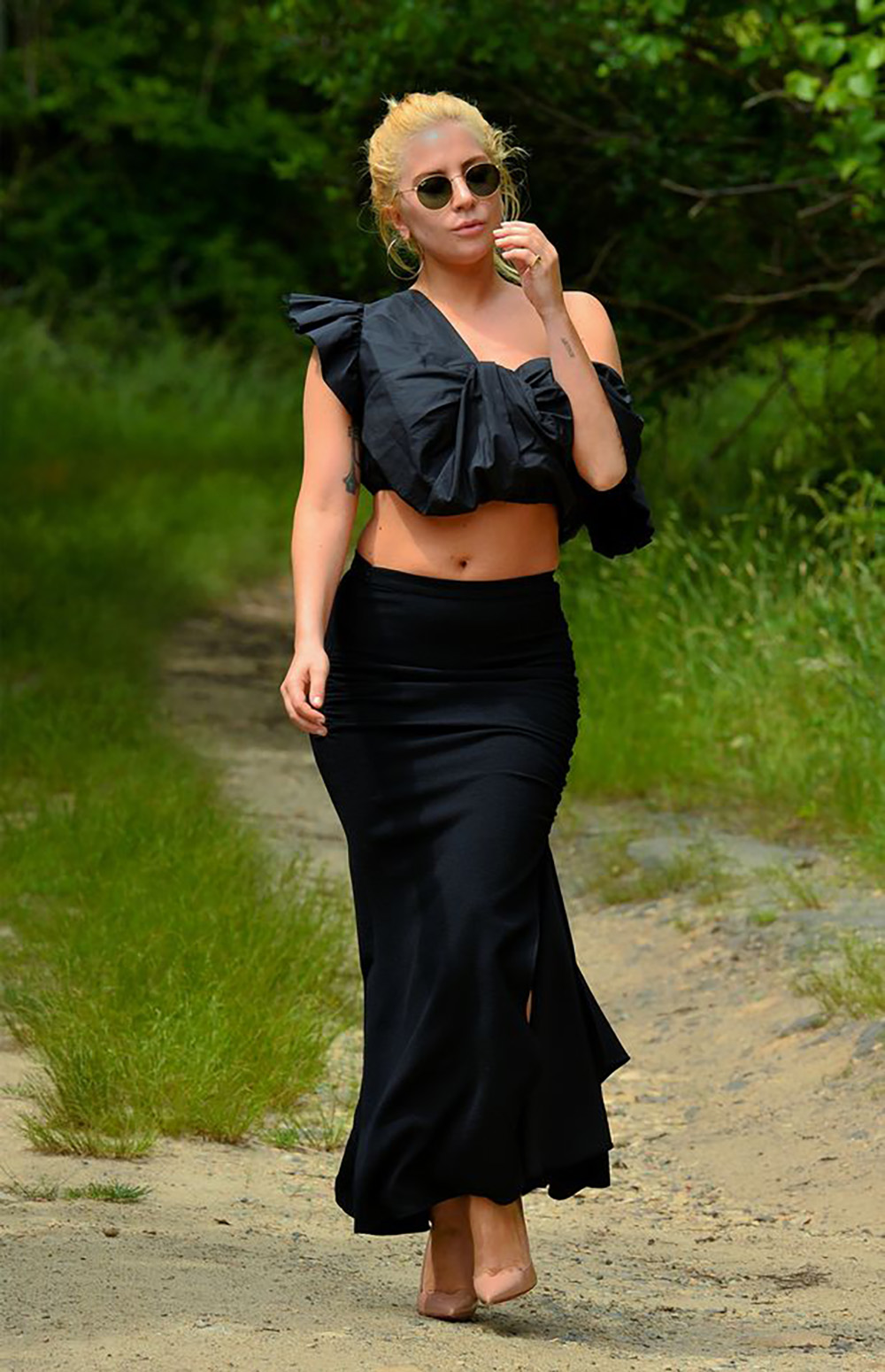 That's why she stepped out for a hike wearing nude heels, a tight black fishtail skirt and a one-shouldered crop top for a walk in the countryside this week.