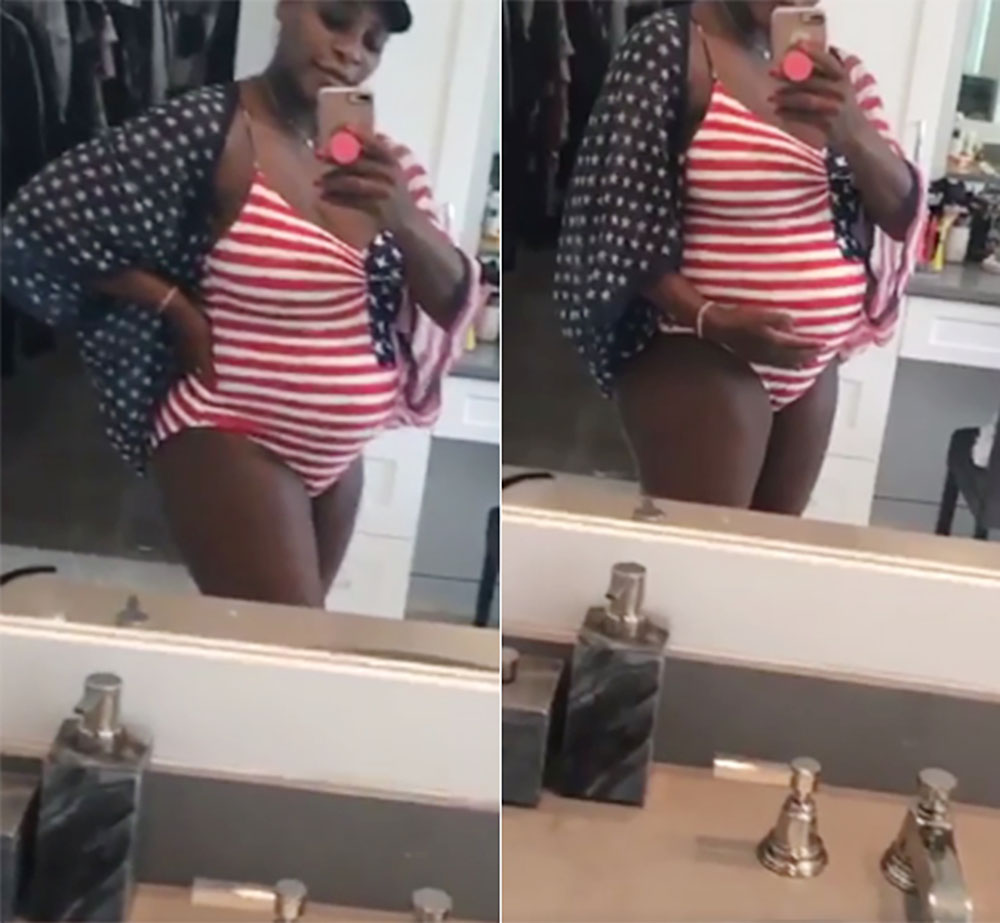 Serena Williams is bumping along nicely! The tennis champion has showed off her blossoming baby bump in a video posted on Snapchat. Serena, who is expecting her first child with fiancé Alexis Ohanian, dressed her curves in a stars and striped red, white and blue swimsuit. As she posed from side to side, giving fans a clear view of her bump, Serena mused: "Hmm, I'm feeling very patriotic today."